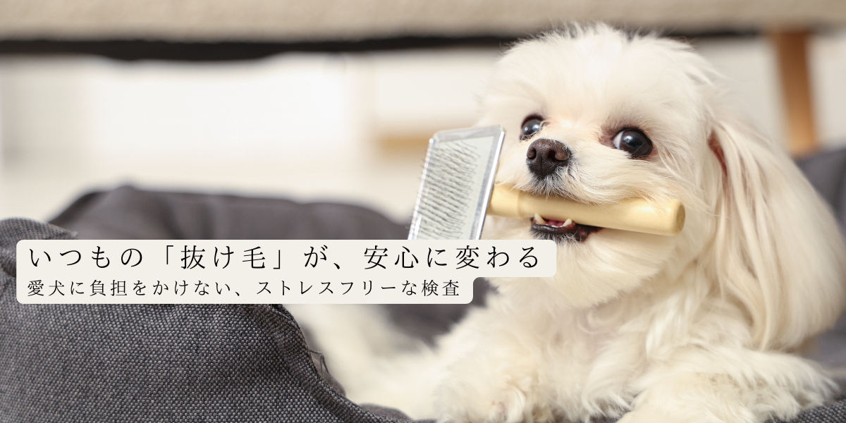 痛みを伴う採血は不要。抜け毛を採取して送付いただくことで、愛犬に負担をかけずに検査できます。抜け毛の少ない犬種も、トリミング時のカットした毛で解析が可能です。